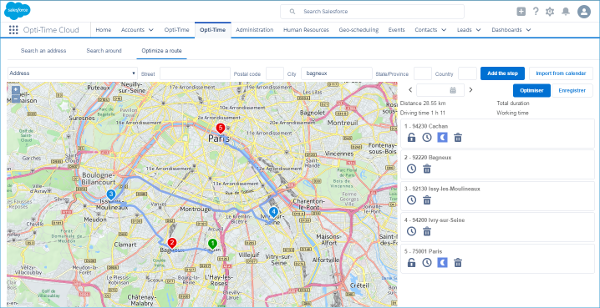 Available on the AppExchange, Opti-Time Cloud enables decision-makers and operational staff to improve their customer knowledge, to better prepare their movements throughout the day and to optimize the schedules of different resources over several days.